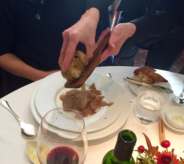 これははあくまでも "オプション" 頼まなくていいです。 ただ、ここで食事をした人の土産話には必ずこのトリュフの話が出る。 ほとんどのテーブルでシュリシュリとやっているので頼まざるを得ない雰囲気になるそうだ。 聞いているだけでは、ヘェ〜そんなもんかねぇ〜、日本人は右習えが好きだからねぇ〜と負け犬の返事だった。 が、その席に座ってると、せっかく来たんだし、シェアしてもいいし、ここはヒトツ頼んでみるかという雰囲気だ。 ボリューム的に2〜3人で一皿を目安に頼むといい。 料理だけで295ドル払ってるから、今更175ドル÷3 どうってことない(とその場で思った)