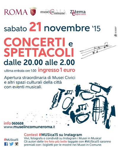 ローマ市は、今週の土曜日2015年11月21日はローマ市営の美術館、博物館などを深夜2時頃まで開け、それらの施設内でコンサートなどを行うイベントを開催します。
