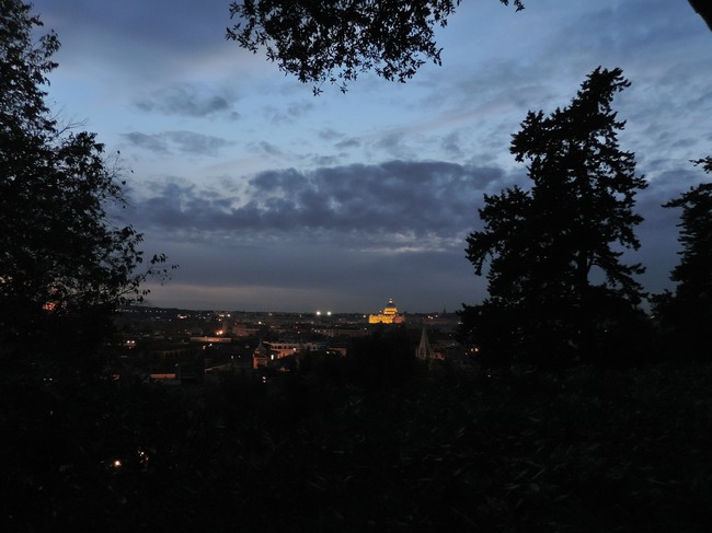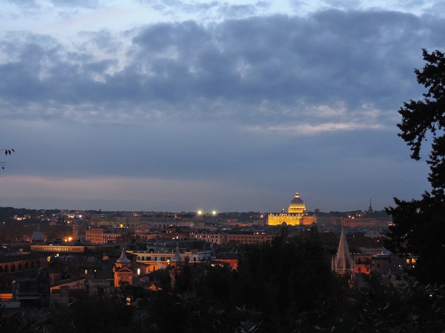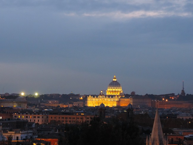 ↑ 写真の右側に見えるのは、大きなクーポラを持つヴァティカン市国のサン・ピエトロ大聖堂です。今日も世界一大きな聖堂は美しくライトアップされています。