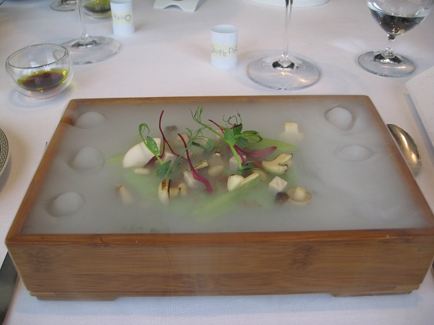 <霧がかかった森をイメージしているのか、ドライアイスのスモークの中から出てくるキノコ料理>