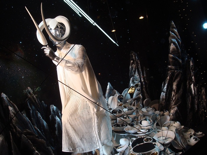 これは蠍(さそり)座なのですが、2体のマネキンが頭にかぶっているヘッド・ピースは日本人デザイナー武田麻衣子さんの作品。ロンドンのセント・マーティンズやロイヤル・カレッジ・オヴ・アートでデザインを学び、現在は「イッセイ・ミヤケ」に所属しているそうです。