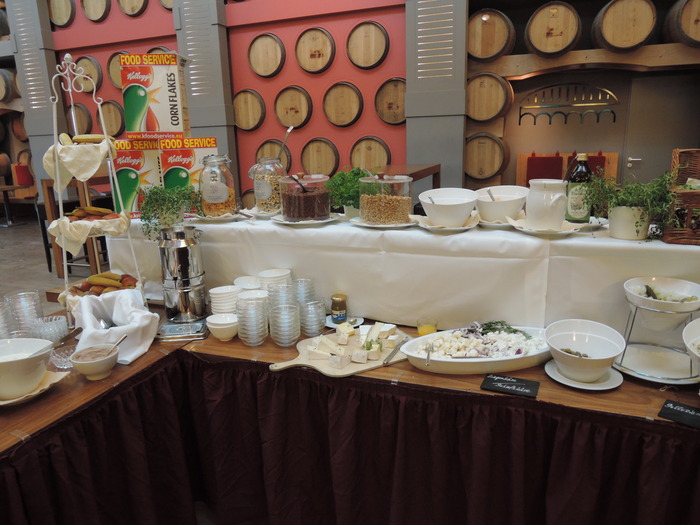 運よく席が空いて、ブッフェ3人分、そのほかにビールのジョッキー2つとミネラルウオーターを注文!いろんな種類のフランクフルトソーセージやベーコン、スクランブルエッグ、サラダ、チーズ、サーモン、パン、ドルチェ、ソフトドリンクなどお好きなものが取りたい放題!