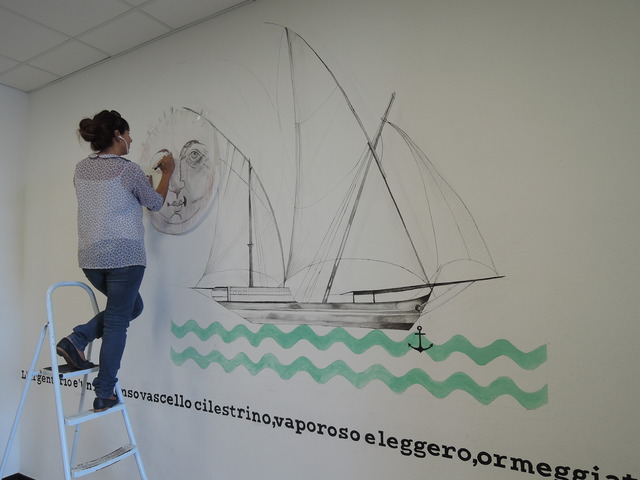 中へ入ってみると女性が音楽を聞きながら壁に絵を書いていました!