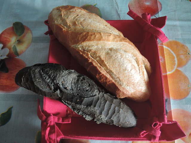 これが、思わず先日買った木炭の真っ黒いバゲットパンです。(苦笑)