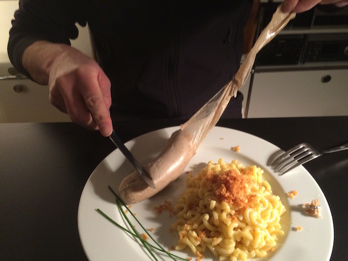 「ソーセージをスライスしていって、その都度はがすんだ」