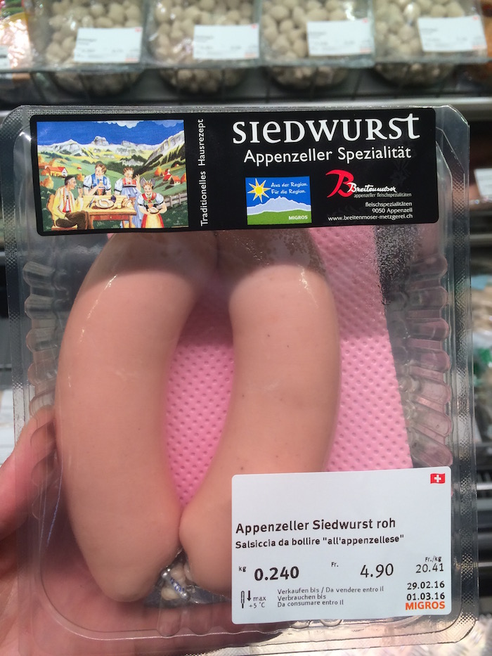 アッペンツェル・アウサーローデンのスーパーマーケットMigros(ミグロ)で見たSiedwurst。生です。