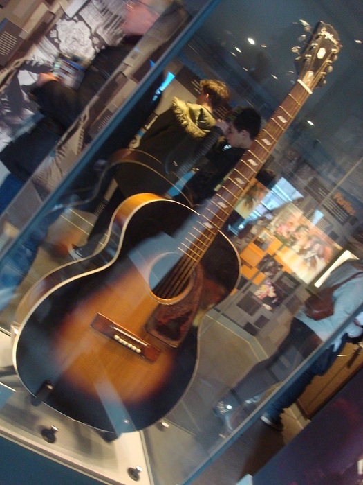 再現された居室の隣には、彼が本当に使っていたギターの一つと共に、様々な写真やビデオで当時の様子を展示していました。