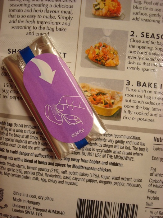 「シーズン&シェイク」というシリーズで、「リッチ・ビーフ・キャセロール」「ケイジャン・チキン」「レモン&ディル・サーモン」等それぞれの料理に特化した調味料と耐熱素材の袋がセットになっています。パッケージ裏側に材料と作り方が記載されているので、すごーく簡単。