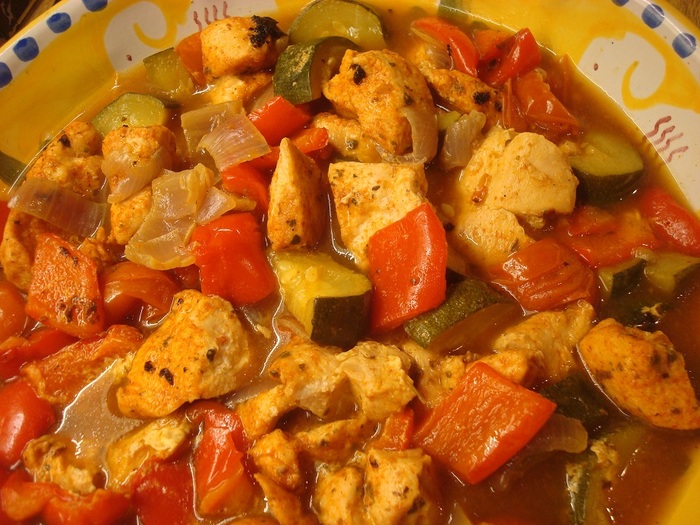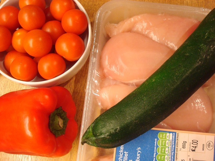 今回は「地中海風チキン」を作ってみますね。用意するのは鶏むね肉、トマト、赤ピーマン、クルジェット(ズッキーニ)。