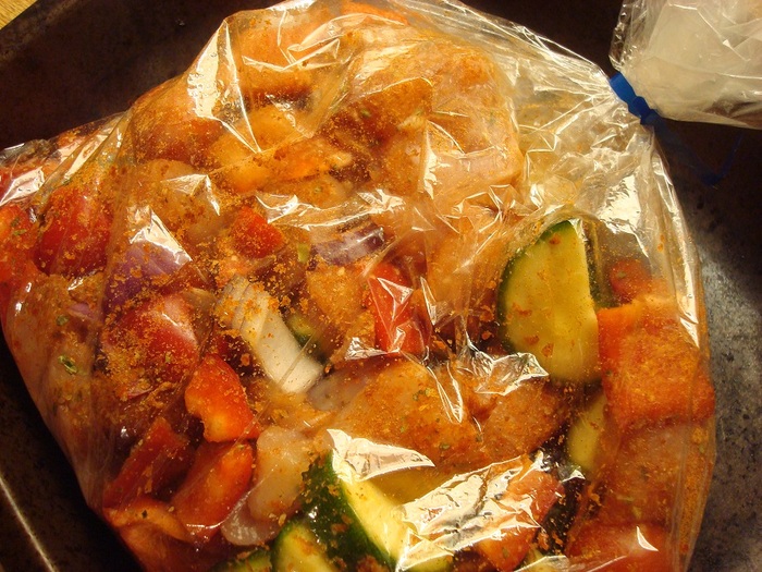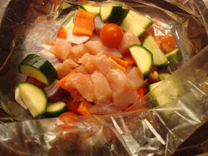 袋の口をハサミなどで開けて、中身を器に取り出します(その際には熱い蒸気に気をつけて)。袋の中で蒸し焼きにされた地中海フレーバーのチキンと野菜、私はライスでいただきましたがパン、ポテト、パスタにも合いそう。