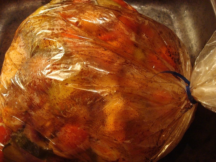 それから調味料を振り入れて袋の口を専用の紐でしっかり留めてから、調味料が全体になじむよう揉み込みます。それを180度のオーヴンに入れて、40分。