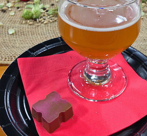 中身はミックスベリー(ブルーベリー、ラズベリー、ブラックベリー)とハイビスカスの香りのゼリー、ピーナッツバターの2段がまえ。こちらは軽くて口当たりのいいブラウンエールのビールと相性が良かったです。