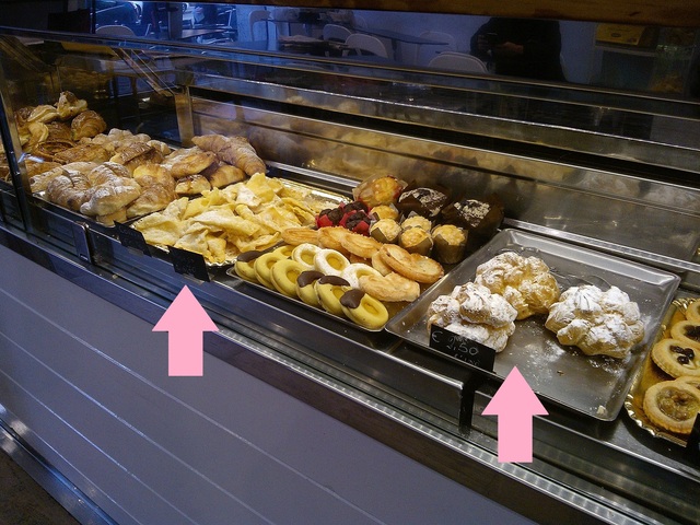 ↑ こちらは特別変わった所のない普通のバールのカウンターの写真ですが、この時期ならではのお菓子が2種類入っています。矢印をつけた2つのお菓子がいつもとは違う面々です。