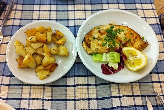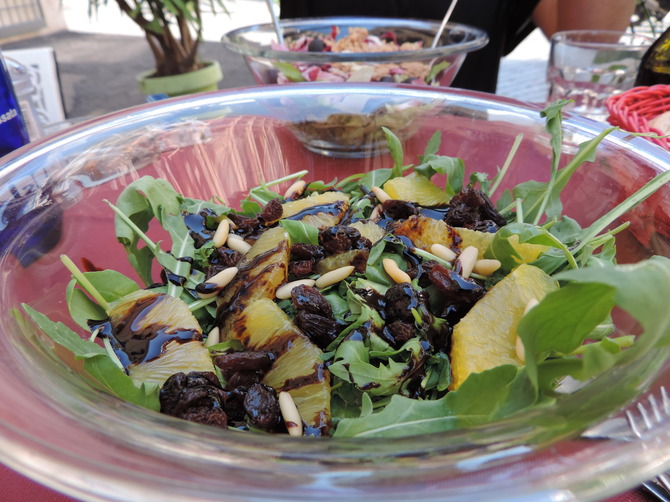 ↑ 続いて、夏の昼食の模様ですが、手前の筆者が頼んだサラダはルッコラ、パイナップル、干しブドウと松の実のサラダです。黒いソースはバルサミコ酢をかけました。バルサミコ酢も登場回数が多いですね。