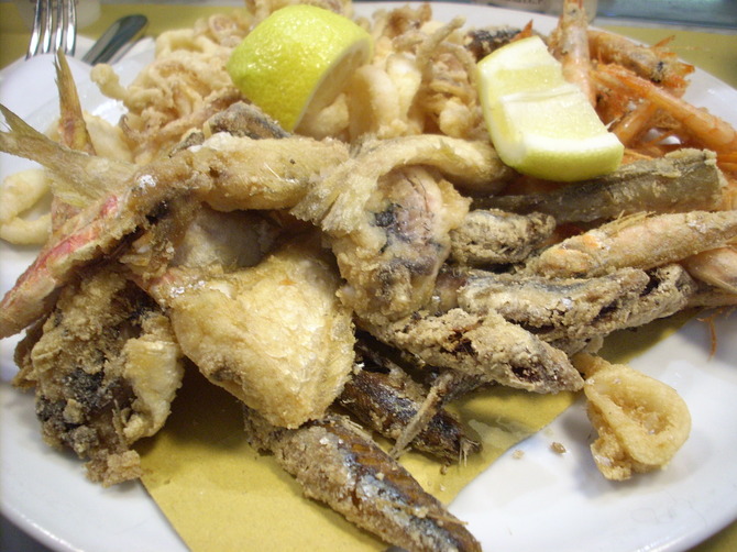 筆者の家の前のバールでは、この「お魚づくしのアペリティーヴォ」は8ユーロでパン、前菜、お魚の料理、飲み物(写真右上に貼り付けました。筆者が頼んだのはカンパリです)が付いてきます。