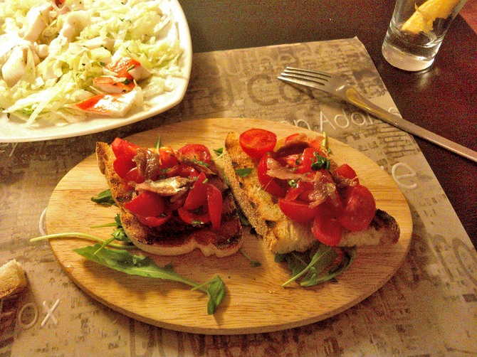 ↑ 「お魚づくしのアペリティーヴォ」に含まれるトマトとアンチョビのブルスケッタです。