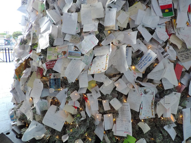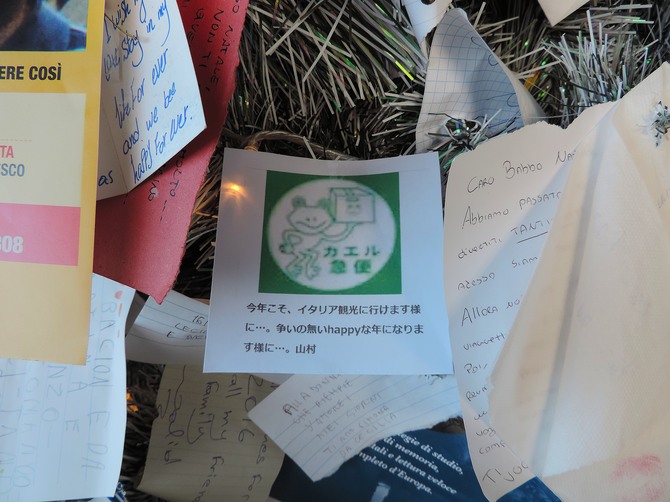 ローマの玄関口ともいうべきターミナル駅、テルミニ駅の500人広場(ピアッツア・ディ・チンクエチェント)側の入口にあるクリスマスツリーは “願いの木(Albero dei desideri)” といって、願い事を書いた紙を付けると願いが叶うと言われています。