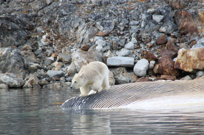 鯨の上に白くま! 充分な餌で平らげるまでどのくらいかかるのか?