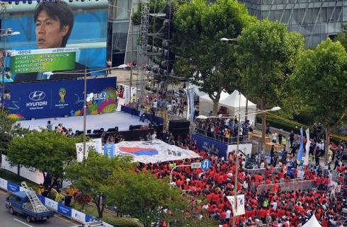 出勤しなくてもいいサポーター達は、ソウル市庁前に集まって応援し、