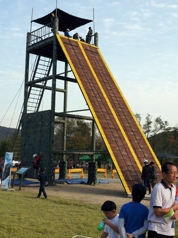 ヘリコプター救助訓練や戦車機動デモンストレーションや音楽隊演奏会などの見事なプログラムを楽しんだ後、是非体験したいのが軍訓練体験!
