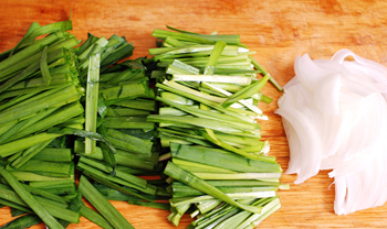 ①ニラはきれいに洗い、4~5cmの長さに切ります。玉ねぎは千切りにします。