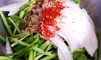 材料:ニラ150グラム、玉ネギ1/4個、唐辛子の粉大さじ1杯、砂糖大さじ1/3杯、しょう油大さじ1杯、塩辛エキス(エクチョ)大さじ1杯、ゴマ大さじ1杯、ゴマ油大さじ1杯