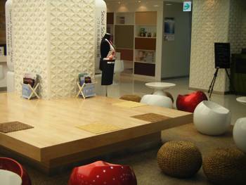 明るい室内中央は休憩室になっていて、丸いイスが置かれ自由に座れるようになっています。