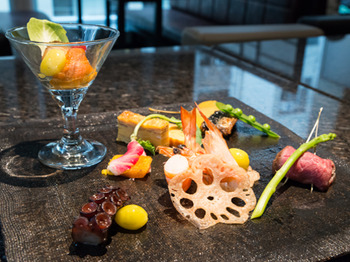 八寸は、4~5時間かけて大根、酒、しょうゆなどと煮込んだ「タコの柔煮」、唐辛子ソースをつかった「いわしの有馬煮」などを中心に、れんこん、エビ、香港らしいピータンなど八寸のルールに合わせた料理が美しく皿の上に乗せられています。値段は5種類(138ドル)と8種類(198ドル)の2つ用意しています。
