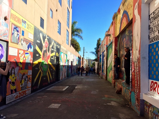 ピンクの壁が超?目立つ『コミュニティースリフトストア(Community Thrift Store)』の細道に壁画群ができてる。 気に入ったミューラルの前で記念を撮っている人たち、ズーーッと向こうまでありそうだ。(壁画の細道)@ 623 Valencia ST