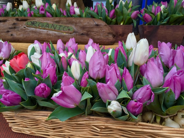 バレンタインデー前日、ファーマーズマーケットでは高さ10㎝の小さいチューリップ(ひと束5ドル)飛ぶように売れていた。(時期的にバラはお花屋さんにしかないのでね)