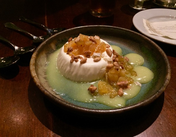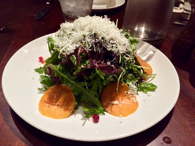削りたてパルメザンチーズがフワッと乗っかり、オリーブオイルの具合もいい感じ、珍しい "富有柿" その極薄スライスをライトに透かしてしまった。