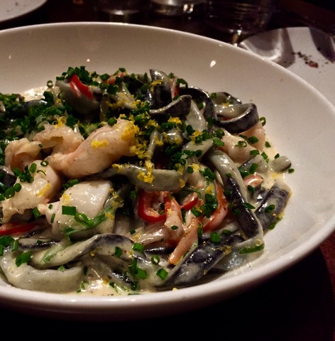 『ガーリックのクリームソース(Bianco Ner)』$23.50も絶品だった☆ 2色を練り合わせたパスタにエビ、イカ、ベルペッパー、ガーリック、ハラペーニョ風味のソースがクリームなのにパンチ効いてる。