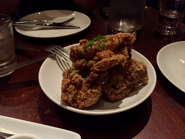 男子のげんこつ大のおきさ、かぶりつくには大きすぎるし何と言っても肉汁が飛びたしちゃうジューシー 『ゼロゼロフライドチキン(Zero Zero Fried chiken)』$14.50 基本は3個だけど、4人だったので一個$4.50で追加してもらった。 かなりなボリュームなので、一人一個にしておきましょ。