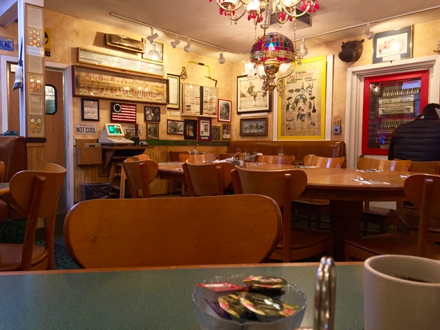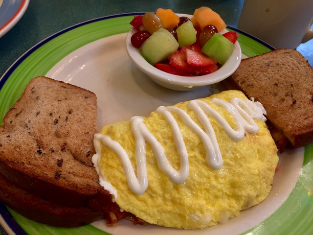メニューは、普通にアメリカンスタイル。 平日朝11時、週末祝日午後2時半まで朝卵料理、パンケーキ、ワッフルを中心にしたブレックファスト。 ランチはサラダ&スープ、サンドイッチ、バーガーetc 値段もコーヒー($4)つけても20ドルくらいで収まる。 写真はDivine's Omellete($13)