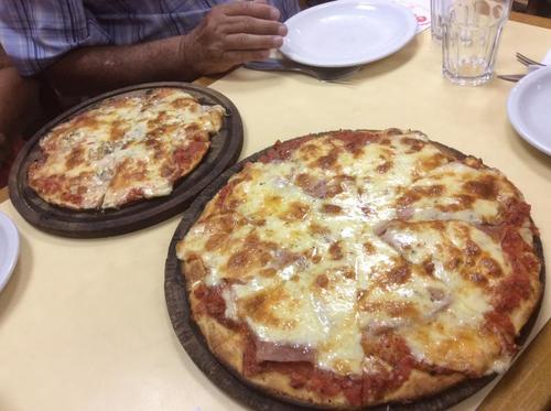 しかしやっぱり、大きなピザが最高です。手前はムッサレーラ コン ハモン(ハム入ピザ) グランデ(大)