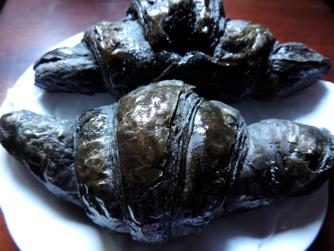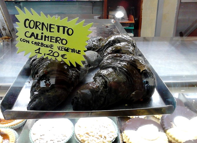 その食べ物とは、その黒さから”イカスミ入りのパン?”と勘違いされることも多い、カーボン(炭)入りのパン類です!まずこちらは、ギョッとする様な真っ黒の色をしたコルネット(Cornetto クロワッサンの意味)です。