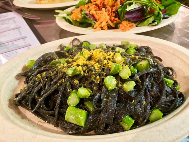 イカスミを練り込んだパスタがあったので、イカスミ&アスパラを頼んだ。 それにレギュラーサラダ(6ドル)も頼んじゃってみた。