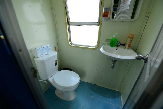 朝7:00定刻出発。白青の車両が乗客用。全席指定、エアコン完備です。