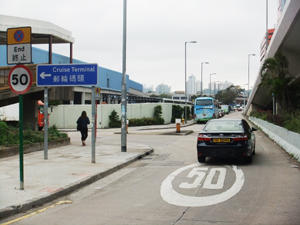 3枚目ですが、こちらも標識は道路の横につけられています。左にいくと「Cruise Terminal/郵輪碼頭」=つまりフェリーターミナルに行けるというのはわかりますが、よく見てもらえるとわかりますが、交差点の直前なのです。香港の地理とか土地勘がない人は、左に曲がるタイミングを逃してしまいがちです。ここだけは、あまり親切でない面が見られます。