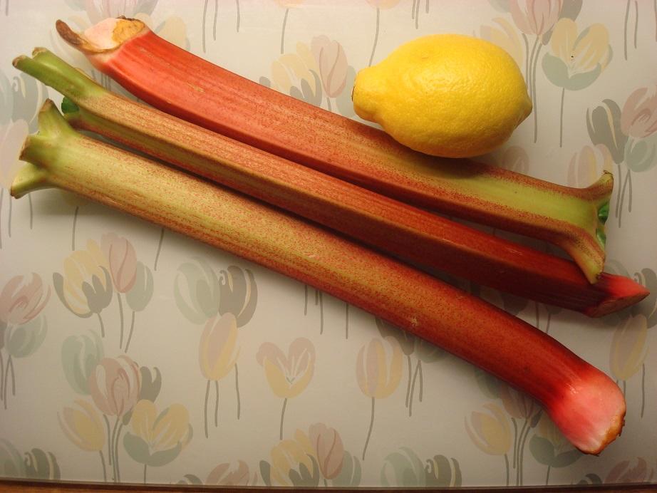 これがルバーブ。大きさの目安になるよう、隣にレモンを置いてみました。見た感じは、赤っぽいセロリやフキに似てますが・・・これ生のままだと、すごーく酸っぱいのです!