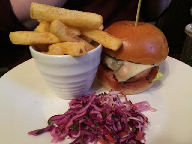 私たちは三人とも仕事帰り。そこで夕食も兼ねて、ビールやワインだけでなくお料理も頼みました。こちらはハンバーガー。