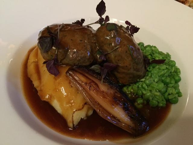 ラムのファゴット(大きな肉団子みたいなもの)には、マッシュ・ポテトとマッシュ・ピーズ。それにシャロット風味のグレイヴィー・ソースがなみなみと・・・。