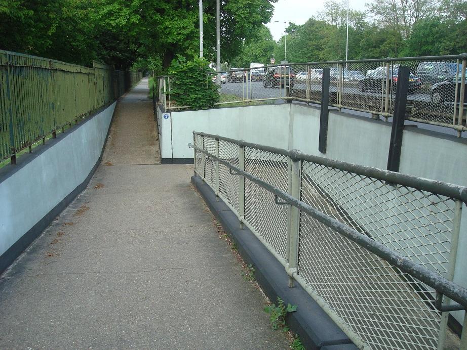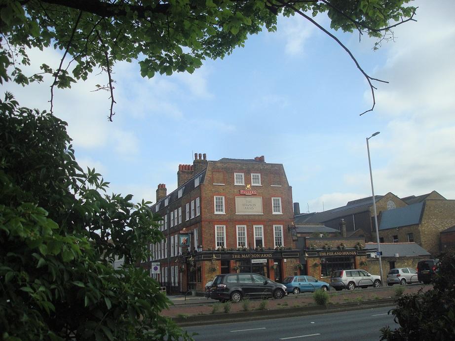 やや唐突に、フラーズ・グリフィン醸造所の直営パブが見えてきます!しかし前方には交通量の多い幹線道路が立ちはだかり、向こう側に渡れる信号も歩道橋もありません。じゃあ、どーするの??