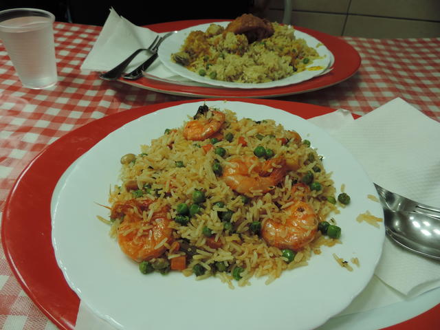 イタリアで食べられる”魚介類のお料理”のご紹介ということで、こちらはテルミ二駅近くで深夜2時頃まで開いているピザ&ケバブ屋さんの海老ライスです。お店はバングラデッシュ出身の兄弟が切り盛りしており、年中無休でケバブサンド、ピザ、各種ライス類やお惣菜が気軽に食べられます。写真の向こう側に見えるのは、ちょっぴりスパイシーなチキン・ライスです!