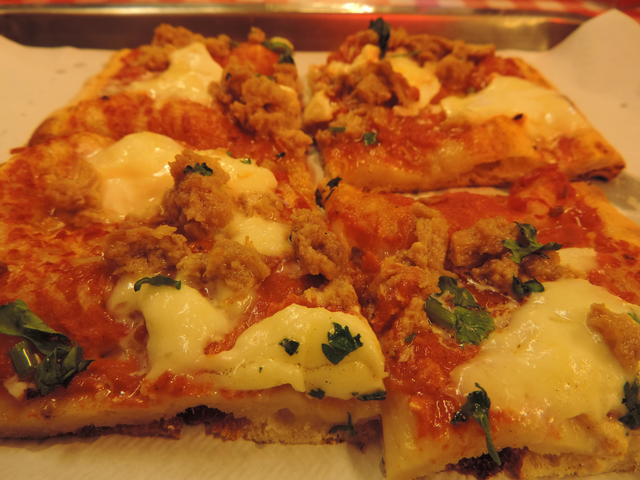 おやつの時間(15時)に寄りました。疲れていたのでテイクアウトせずにお店にどっしり座って食べました。お魚はツナでモッツアレッラチーズとトマトソースがベースになっています。イタリアのピザのトッピングに良く使われているお魚一位はアンチョビです。鮭も使われます。サーモンのピザは良く白ピザでルッコラ(ルッコラについてはその1参照)やズッキーニとの組み合わせになっています。