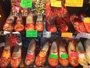 スリッパは中国らしくパンダをあしらった物、中国の伝統的な柄を使った物などさまざま。色も赤を中心に、ピンク、ゴールド、黒、緑、紫など見ていて楽しくなります。同じ柄でも異なるサイズを1足ずつ製作するだけなので、事実上、世界で1つだけのサイズになります。スパンコールやビーズをふんだんに使っていますが、見た目以上に手間がかかるそうで、最低でも作るのに1週間は必要とのこと。しかし、価格は200ドルから400ドル程度とお手頃価格なのはちょっと驚きでもあります。また、ちょっとした小物も売っているので、店をのぞくと楽しめるとおもいます。