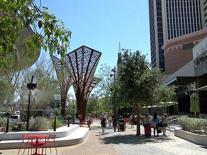 さて、ストリップからこのアリーナまで続くプロムナード「The Park」もオープンしました。モンテカルロホテルとニューヨークニューヨークホテルの間、アリーナまでの道沿いにゆったりと作られた遊歩道は、名前のとおり「公園」そのもの。レストランが軒を並べるだけでなく歩道には木陰も多く作られているので、のんびりと散歩を楽しめますよ。イベントの前や終わったあとに「ちょっと一杯」なんてさくっと利用できるのもうれしいですね。