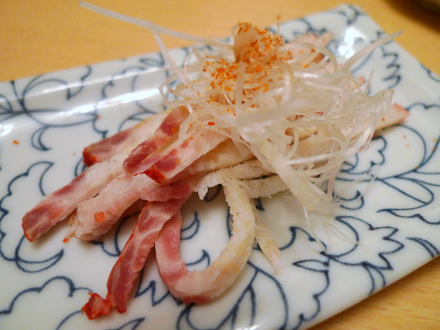 ネギ、とうがらしといただくクジラベーコンは、さっぱりしてこれまた美味。