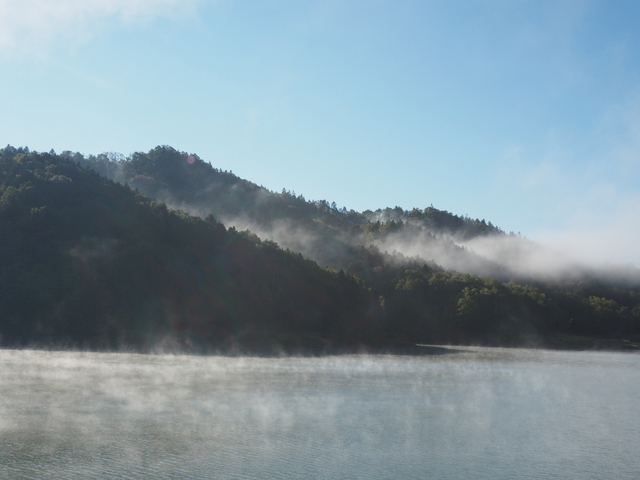 晴れ渡る日差しの中、湖面から立つ