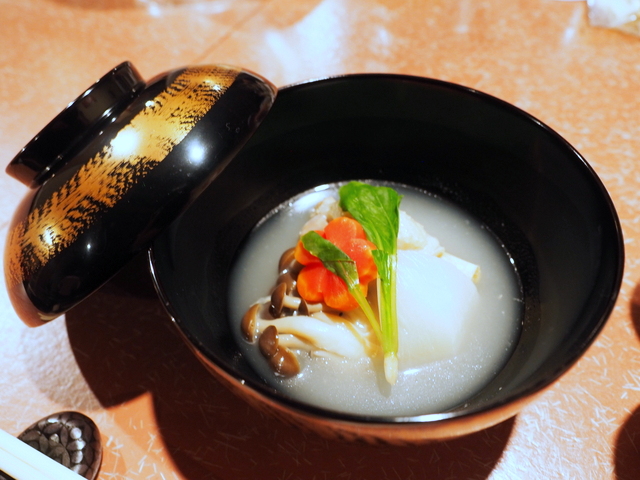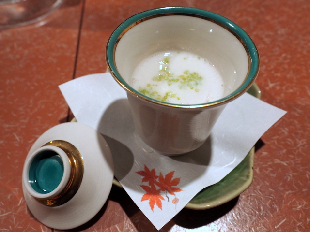 Small soup-type appetizer : pureed soup of soft roe with ginger and Japanese honewort